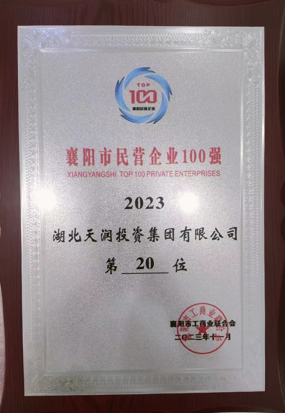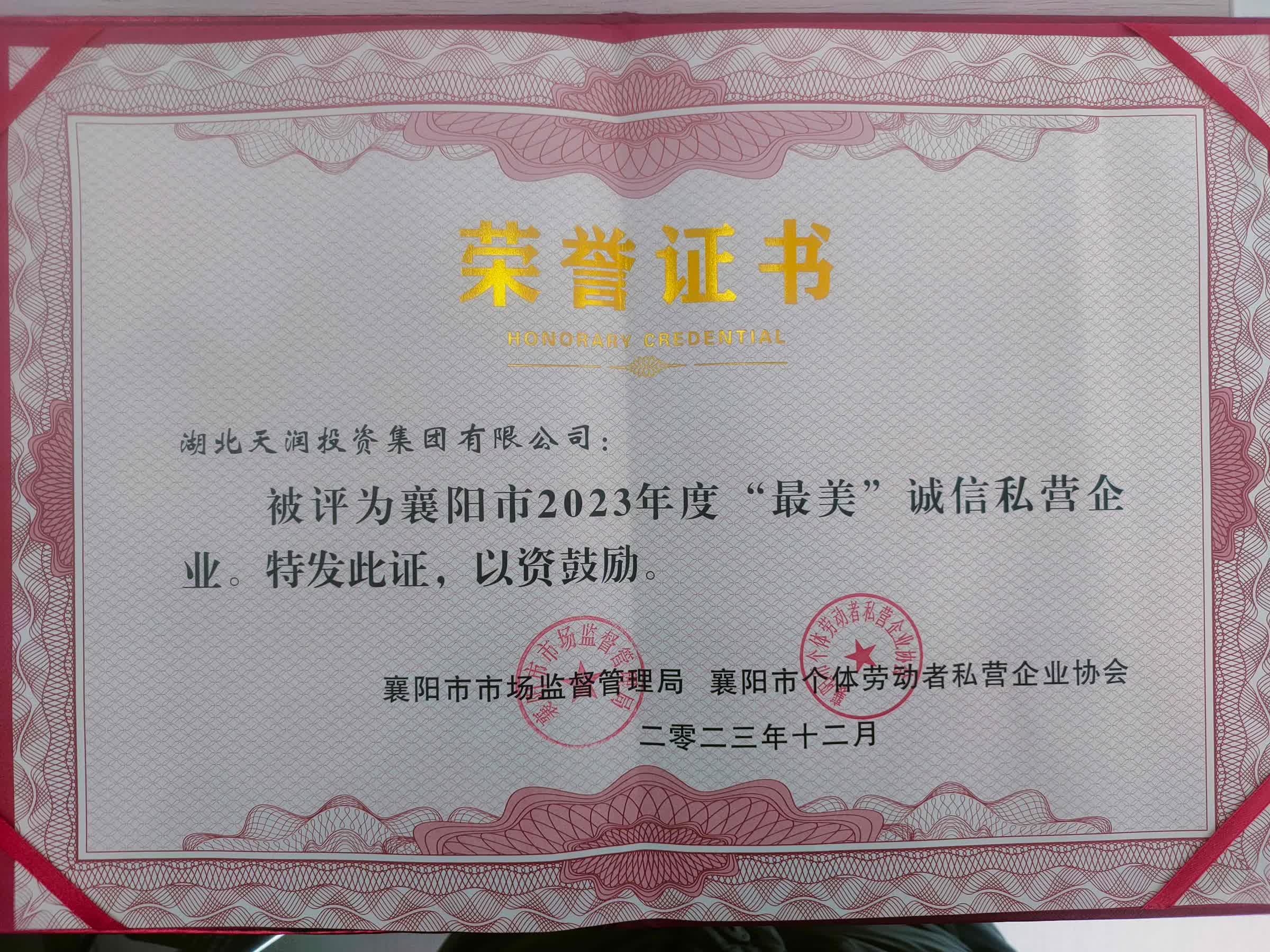 湖北天潤投資集團(tuán)有限公司 被評為囊陽市2023年度“最美”誠信私營企業(yè)。